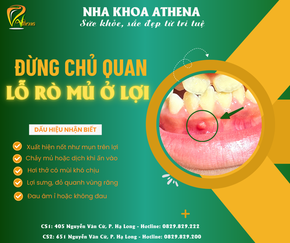 Tại Nha khoa Athena Hạ Long, nhiều trường hợp lỗ rò mủ ở lợi đã được phát hiện sớm và điều trị hiệu quả nhờ hệ thống chẩn đoán hiện đại và đội ngũ bác sĩ giàu kinh nghiệm. Với hơn 10 năm hoạt động trong lĩnh vực nha khoa, Athena không ngừng đầu tư trang thiết bị tiên tiến như hệ thống chụp phim công nghệ cao, giúp xác định chính xác nguyên nhân và mức độ tổn thương. Đội ngũ bác sĩ được đào tạo bài bản từ các trường uy tín như Đại học Y Hà Nội và Đại học Răng – Hàm – Mặt, có kinh nghiệm trong điều trị các bệnh lý răng miệng từ đơn giản đến phức tạp.