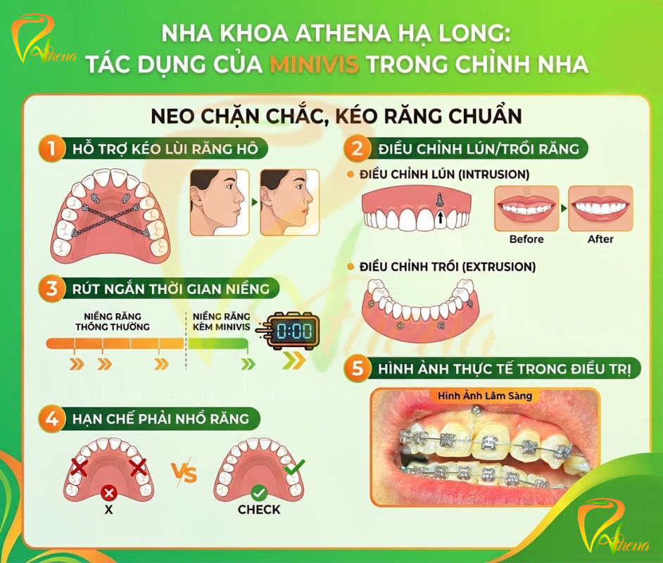Với định hướng điều trị toàn diện, không chỉ dừng lại ở việc làm đều răng mà còn hướng tới sự hài hòa khuôn mặt và chức năng ăn nhai, Nha khoa Athena Hạ Long đã và đang trở thành địa chỉ tin cậy cho những khách hàng mong muốn chỉnh nha hiệu quả, an toàn và bền vững. Sự kết hợp giữa công nghệ hiện đại, chuyên môn bác sĩ và ứng dụng Minivis một cách hợp lý chính là yếu tố tạo nên sự khác biệt, giúp mỗi ca điều trị đạt được kết quả tối ưu cả về thẩm mỹ lẫn sức khỏe lâu dài.